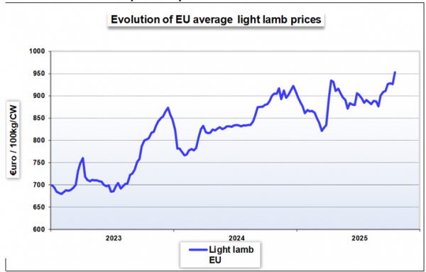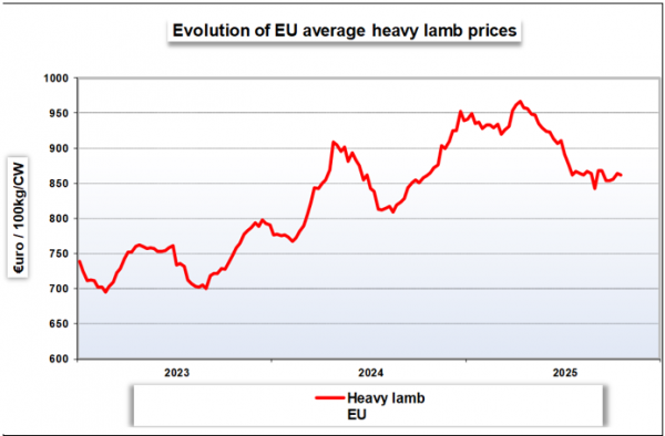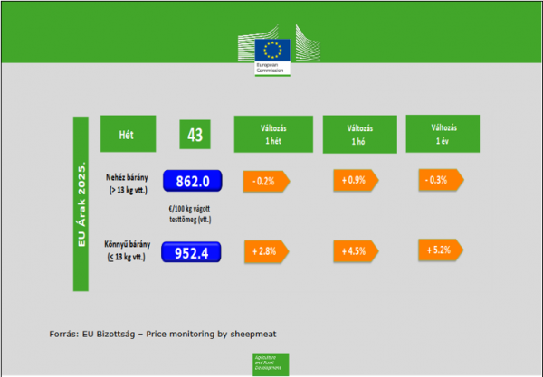 A nehéz bárány átlagára az EU-ban a 2025. október 26-val végződő 43. héten 862,0 euró/100 kg vt. (vt. = vágott testtömeg), a könnyű bárány átlagára pedig 952,4 euró/100 kg vt. volt. A nehéz bárányár esetében -0,2%-os csökkenés, a könnyű bárányár esetében pedig 2,8%-os emelkedés volt tapasztalható az egy héttel korábban rögzített értékekhez képest (42. heti árak: nehéz bárány átlagár 864,5 euró/100 kg vt., könnyű bárány átlag 926,7 euró/100 kg vt.).