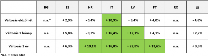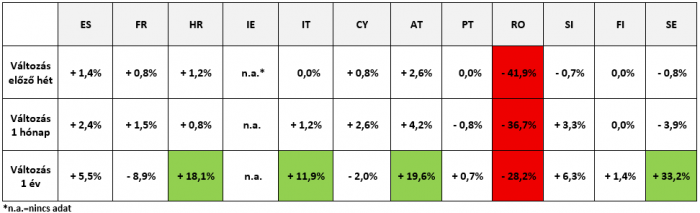A 43. héten a nehéz bárány árak Olaszországban, Portugáliában és Finnországban nem változtak, Írországra vonatkozóan pedig adat nem áll rendelkezésre.